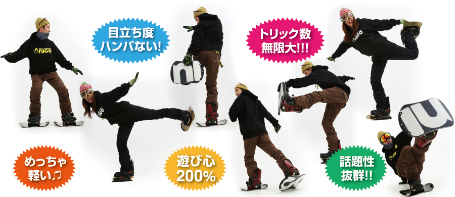 Separate-Snowboards®「NICO(ニコ)」は、ブランド名そのままに2枚の板からなるスノーボードです。『スキーとスノーボードの融合』『フリーラインスケートのスノー版』など、様々な見方が出来ますが、そのスタイルはまだまだ未知数です。それほど現段階でその存在を知る人は少なく、どの様なスタイルのスノースポーツへ進化を遂げるかは、未開拓のスポーツ遊具です。